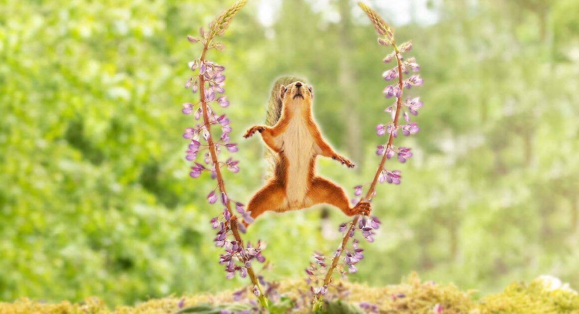 Geert Weggen, 53, of Bispgรฅrden, Sweden, captured this video of squirrels showing off their gymnastic skills on plants and flowers in order to reach strategically placed buckets of nuts. The tricks and balancing acts performed here are remarkable to see!