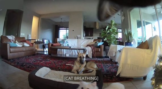 But when Mom busted the dog chewing on a photo frame, the cats decided to show up and thwart her efforts. It’s a coverup—nothing to see here! Watch as the kitties get right up in the camera blocking the view… Too funny! 😀