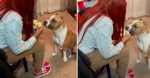 Cameron the 1-year-old pit bull can’t help but notice that Mom has a tasty sandwich for lunch. The temptation is there to snag it right out of her hands, but the dog remains obedient and well-behaved. Because of this, Ashley rewards him by saying he can have a small bite…