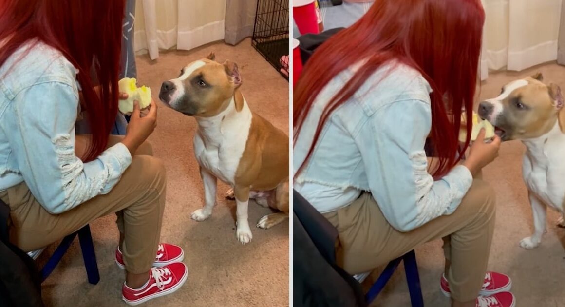 Cameron the 1-year-old pit bull can’t help but notice that Mom has a tasty sandwich for lunch. The temptation is there to snag it right out of her hands, but the dog remains obedient and well-behaved. Because of this, Ashley rewards him by saying he can have a small bite…