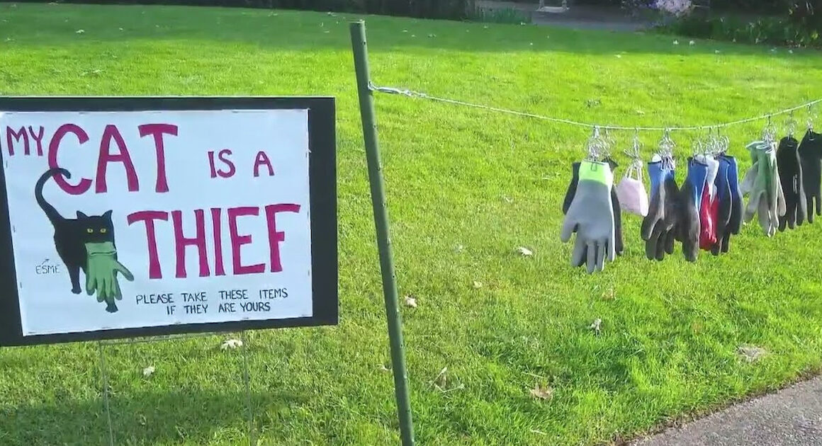 Kate Felmet felt she had no choice but to call out her cat and her thieving ways after stealing so many items from neighbors’ garages and the nearby park. Gloves, masks, cloths, you name it. She put a sign in the front yard with the items so that people could get their belongings back!