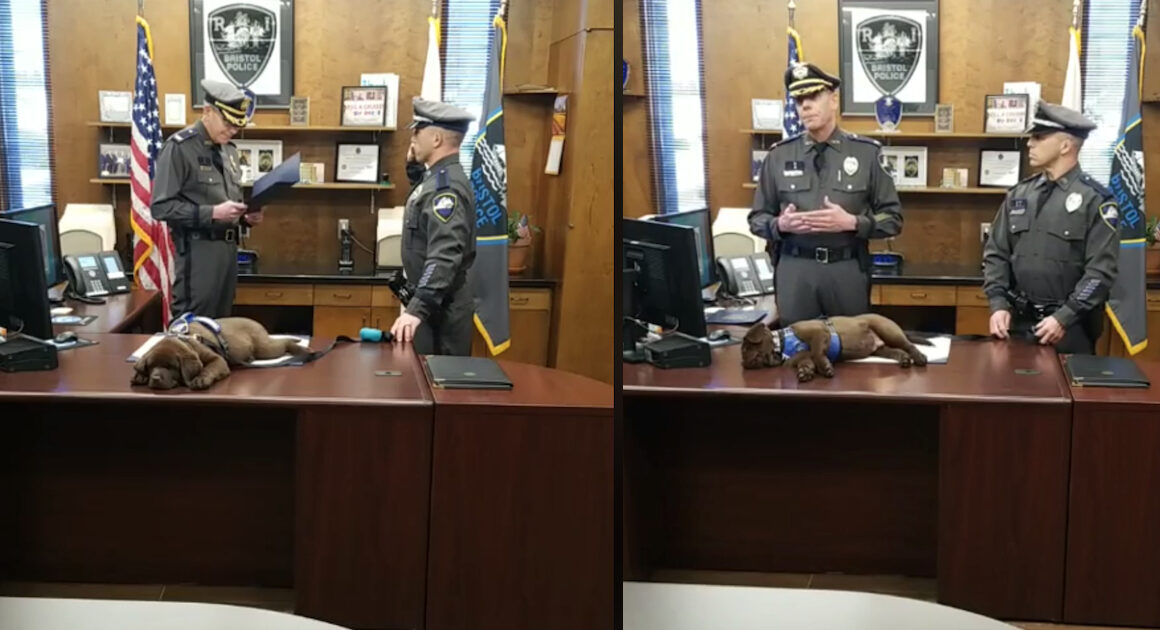 The Bristol Police Department in Rhode Island recently held a swearing-in ceremony for the latest addition to the squad, Brody the new K9 pup! But the little guy couldn’t help but nap through the entire thing. π