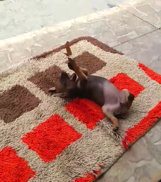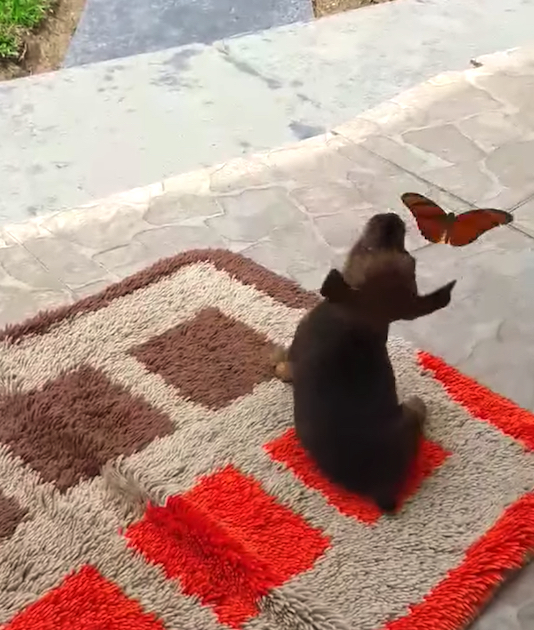 Lúcia Kohl Dalmolin looked out to see that the puppy had seemingly made a brand new friend. Right there outside the door the little pup was sharing an adorable moment with a friendly butterfly! You just had to see it! Thankfully, it was caught on camera. 🙂