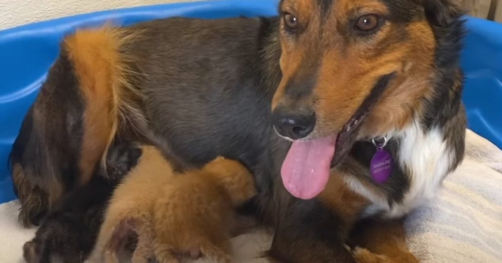 Milo the dog lost all of her puppies at birth, and she would desperately look around for them wondering where they were. It was such a sad sight, so Sunshine Dog Rescue asked around for any puppies who might need a mother. That’s when some orphaned kittens were offered…