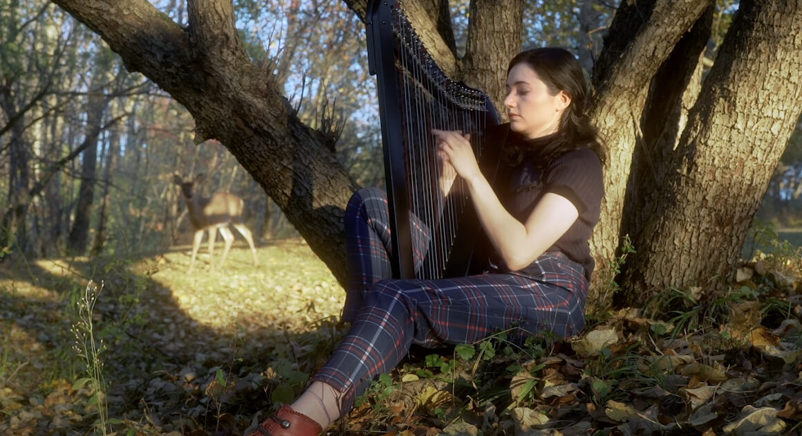 Naomi takes to the woods with her harp once again, and like clockwork, it’s not long before she has an audience! She starts playing “Green Grass” by Tom Waits, and it appears to be a favorite… π