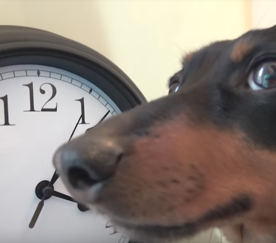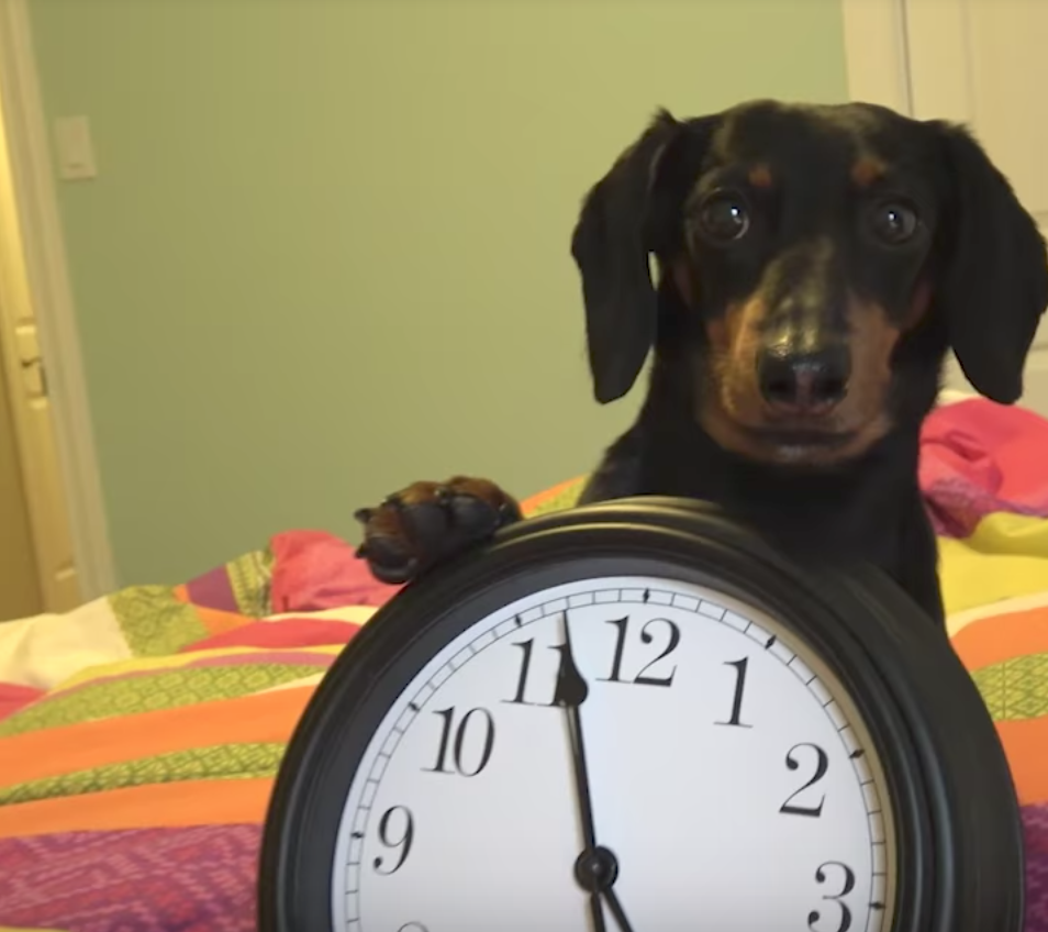 Crusoe is a Dachshund, so he’s always hungry. He gets his dinner at a certain time each day, but he’s figured out a way to play the system.