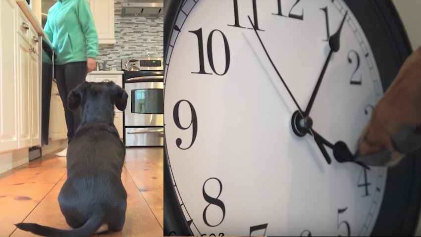 What a slick dog! He just bumps the hour hand up to 5 o’clock and tries again, this time with dad. Huh, it’s a lot later than dad thought. Okay, here’s your dinner.