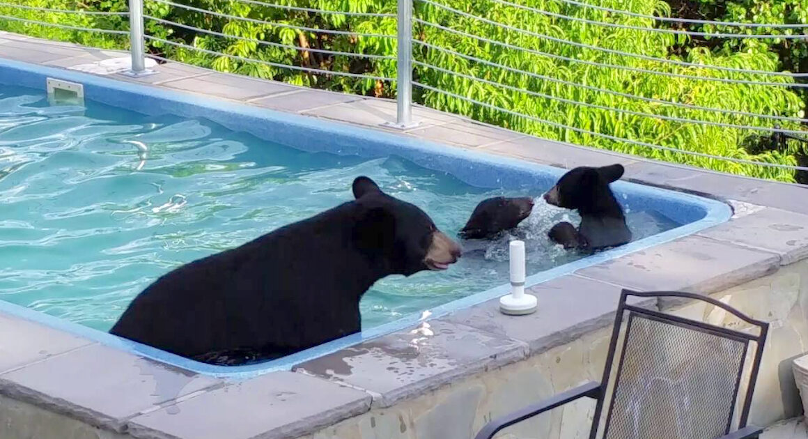 They Look Outside & See That A Bear Family Has Decided To Cool Off In The Pool