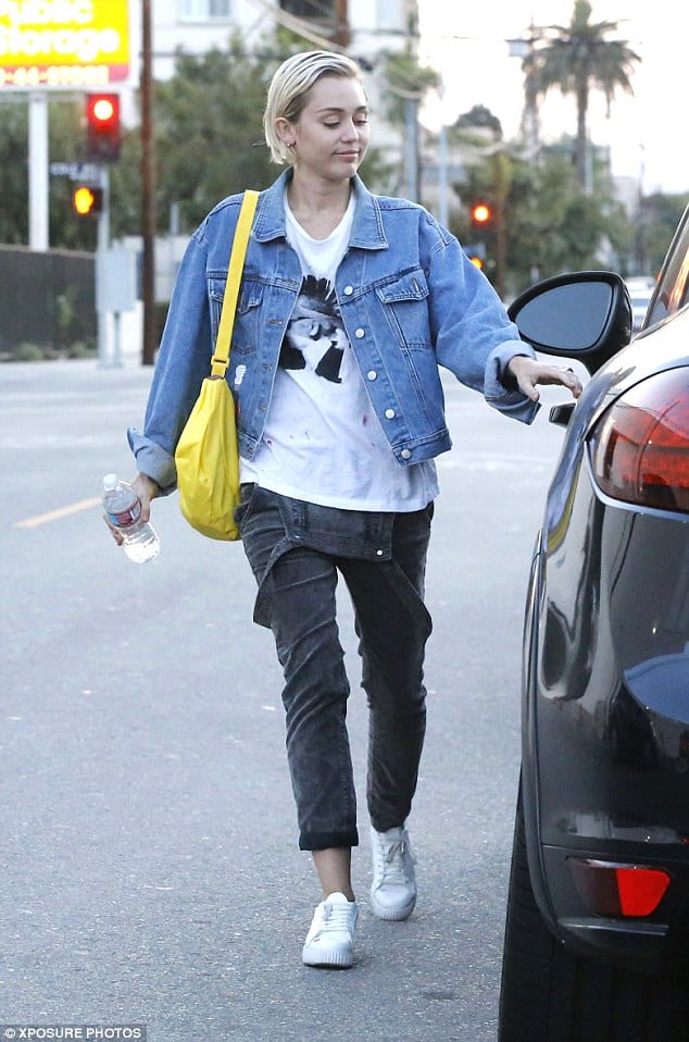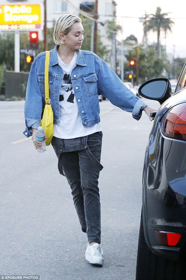 On a leisurely Saturday afternoon, Miley Cyrus was spotted shopping in West Hollywood, sporting a casual and modest outfit. The 22-year-old celebrity chose to wear a double denim ensemble, featuring faded black dungarees paired with a loose graphic print top, a denim jacket, and white trainers. To add a pop of color, she carried a bright yellow handbag and kept her makeup minimal while styling her hair away from her face. Joining her was her model friend Stella, who flaunted her long legs in a pair of grey shorts, black boots, a graphic print top, and a leather jacket