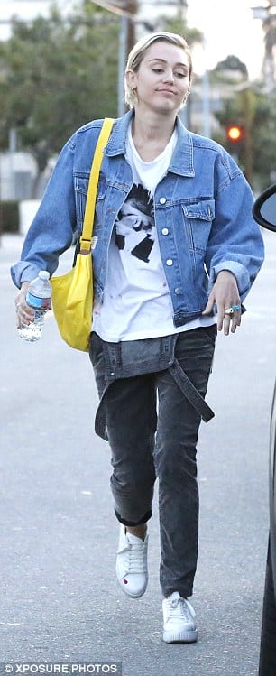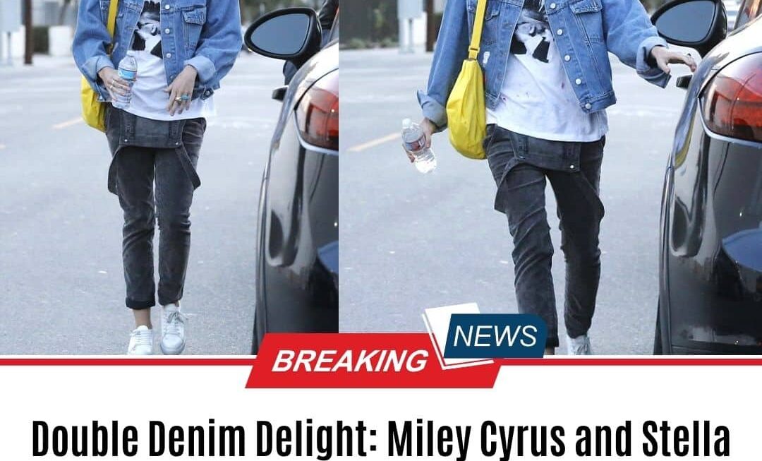 On a leisurely Saturday afternoon, Miley Cyrus was spotted shopping in West Hollywood, sporting a casual and modest outfit. The 22-year-old celebrity chose to wear a double denim ensemble, featuring faded black dungarees paired with a loose graphic print top, a denim jacket, and white trainers. To add a pop of color, she carried a bright yellow handbag and kept her makeup minimal while styling her hair away from her face. Joining her was her model friend Stella, who flaunted her long legs in a pair of grey shorts, black boots, a graphic print top, and a leather jacket