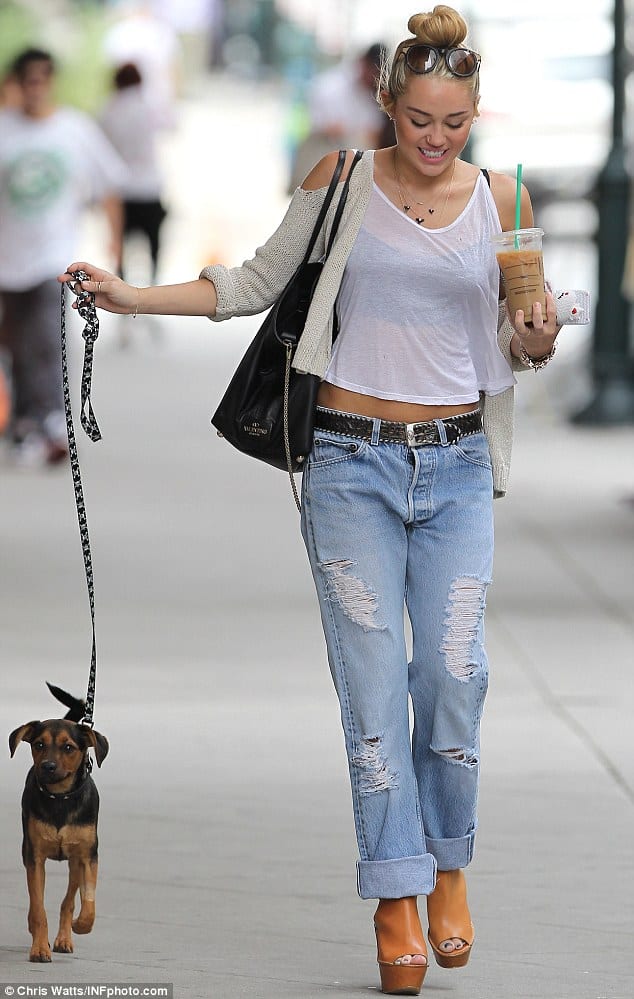 Miley completed her laid-back outfit by combining distressed jeans that were cinched at her slender waist with a stylish belt. She elevated her stature with a pair of trendy tan wedge heels and carried a spacious leather handbag.