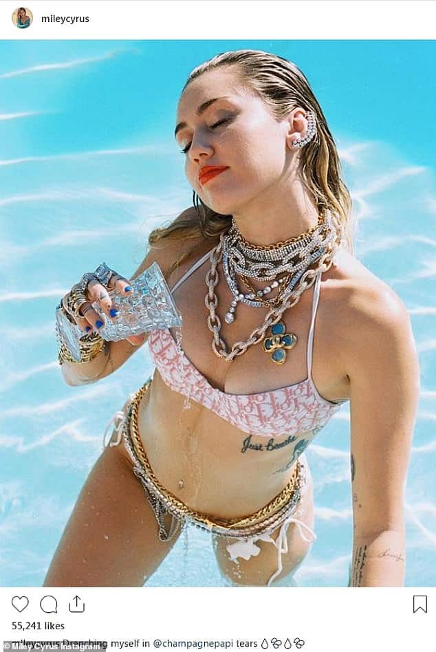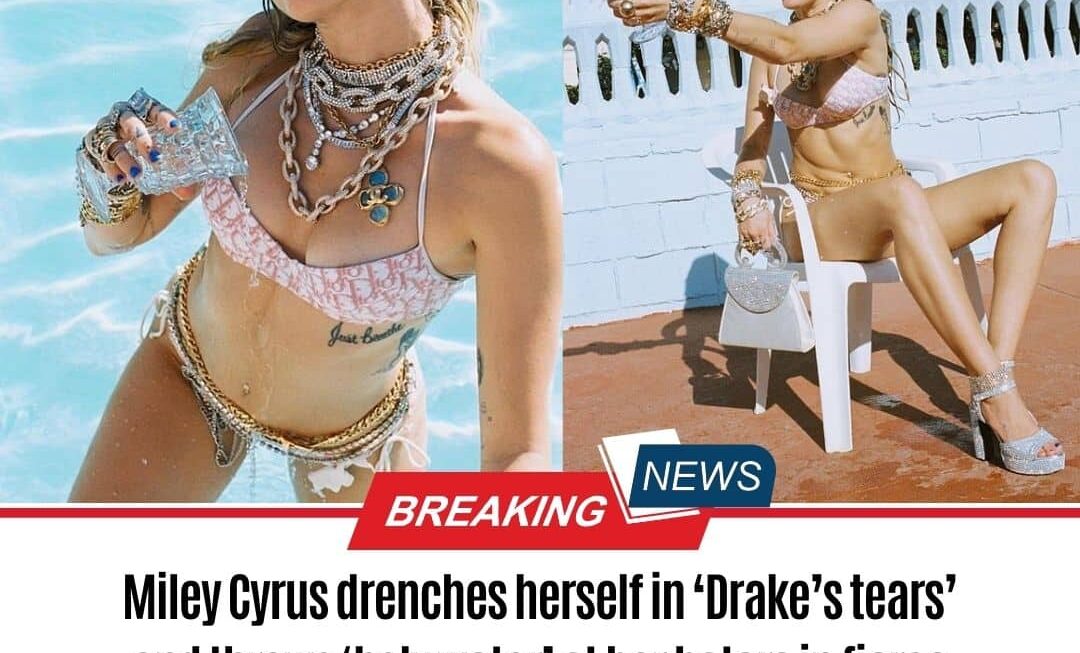 Miley Cyrus drenches herself in ‘Drake’s tears’ and throws ‘holy water’ at her haters in fierce new bikini snaps