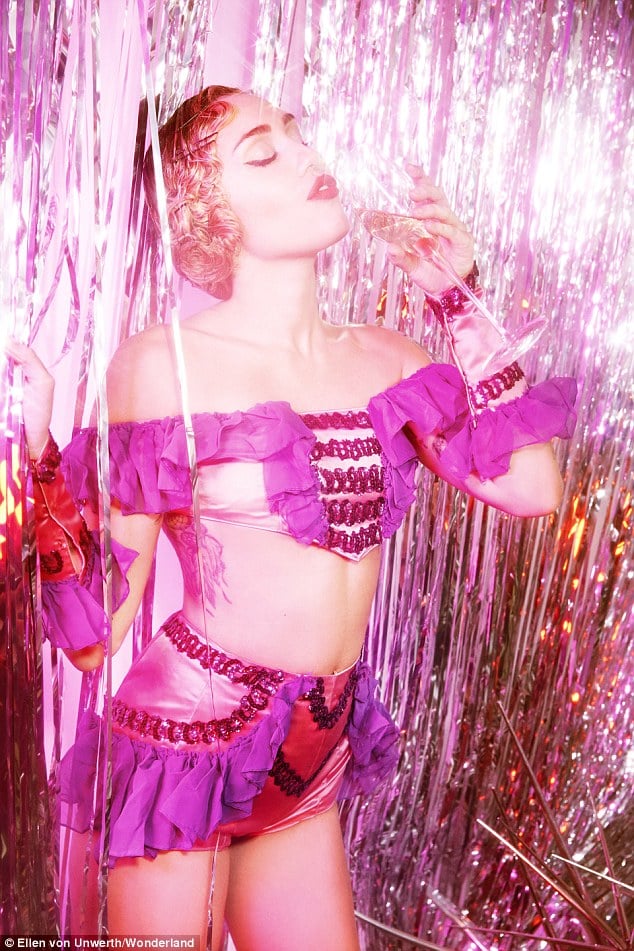 One image from the shoot – which is the work of celebrated German photographer Ellen von Unwerth – depicts a champagne-sipping Miley flaunt her toned torso in a pink two-piece which is embellished with sequins and frills.