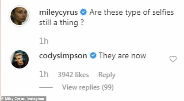 The post showed that Miley was impressed with the selfie trend. Her ex-partner, Cody, responded to the post saying that the trend is still going strong. Miley had previously stated that her exes, including Cody, were not good people and that she thought she was gay because she believed all men were evil. However, she now believes that there are good men out there, and Cody is one of them. During a live video chat with him, she encouraged her fans not to give up on finding a good man