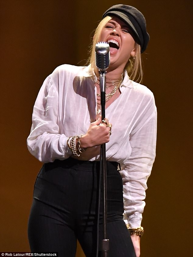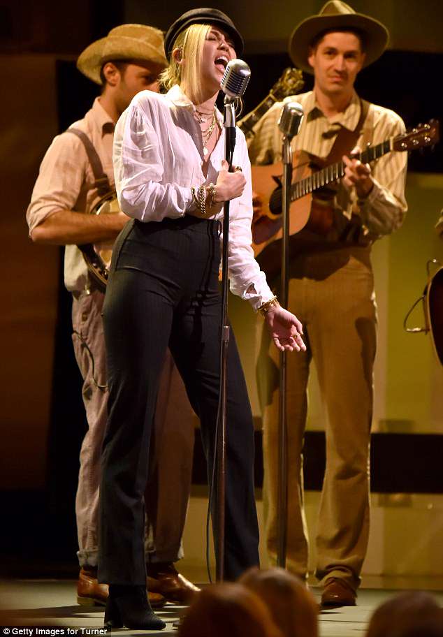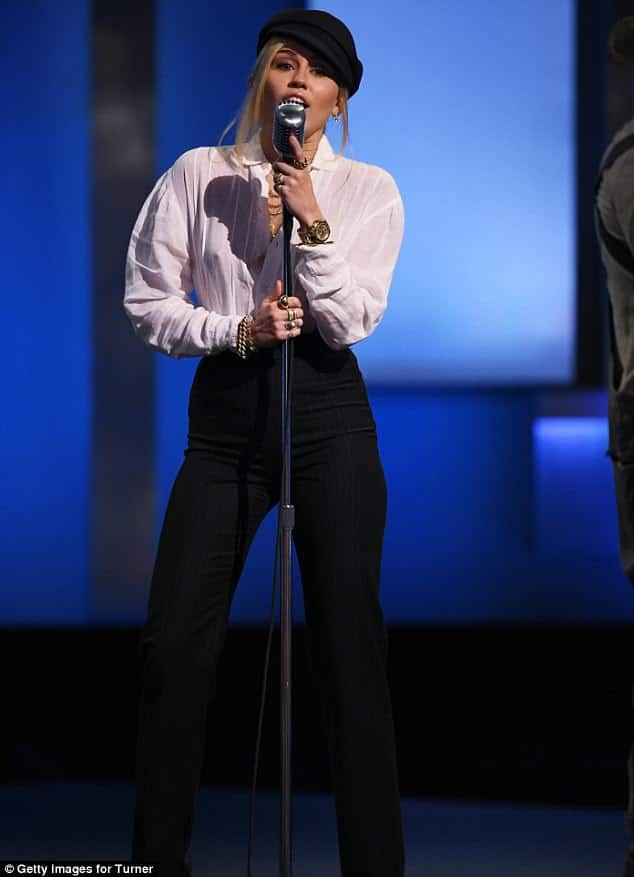 Miley Cyrus graced the spotlight alongside a band of dapper male musicians, rocking a fashionable ensemble inspired by the wild frontier. Adding a touch of sleekness to her outfit, Miley opted for high-waisted pants adorned with black and white pinstripes.