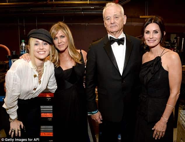 The artist, at the age of 25, skillfully arranged her disheveled white shirt, intentionally leaving a few buttons undone to proudly exhibit her exquisite assortment of necklaces. An impressive sight, she caught the attention of none other than Bill Murray, her co-star in a trio of films, namely The Monuments Men, Fantastic Mr. Fox, and A Very Murray Christmas. Engaging in delightful conversation, Miley and Bill indulged in refreshing iced drinks adorned with slices of tangy lemon, while a table beside them showcased a bottle of Belvedere vodka. Captivating the moment, the pair was also seen engaging with two illustrious television personalities, Jennifer Aniston and Courteney Cox, both renowned for their unforgettable roles in the beloved 90s sitcom, Friends.