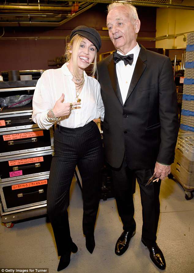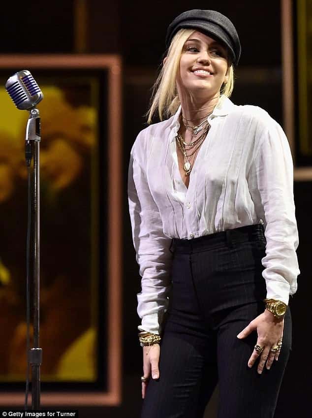 George Clooney, the seasoned actor, was granted the prestigious Lifetime Achievement Award by the esteemed American Film Institute this year. To commemorate this momentous occasion, an extravagant gala was held on Thursday, featuring the multitalented Miley Cyrus as one of the co-stars. Miley chose to outfit herself in a striking ensemble, consisting of black and white pinstripe high-waisted pants. Accompanied by a group of male musicians donning frontier-style attire, she exuded a unique sense of style. Her deliberately rumpled, yet artfully tucked-in white shirt was left partially unbuttoned, showcasing her vast collection of necklaces. With her blonde tresses elegantly swept back, a few strands framed her face, perfectly complementing her overall appearance, topped off with a pageboy cap.