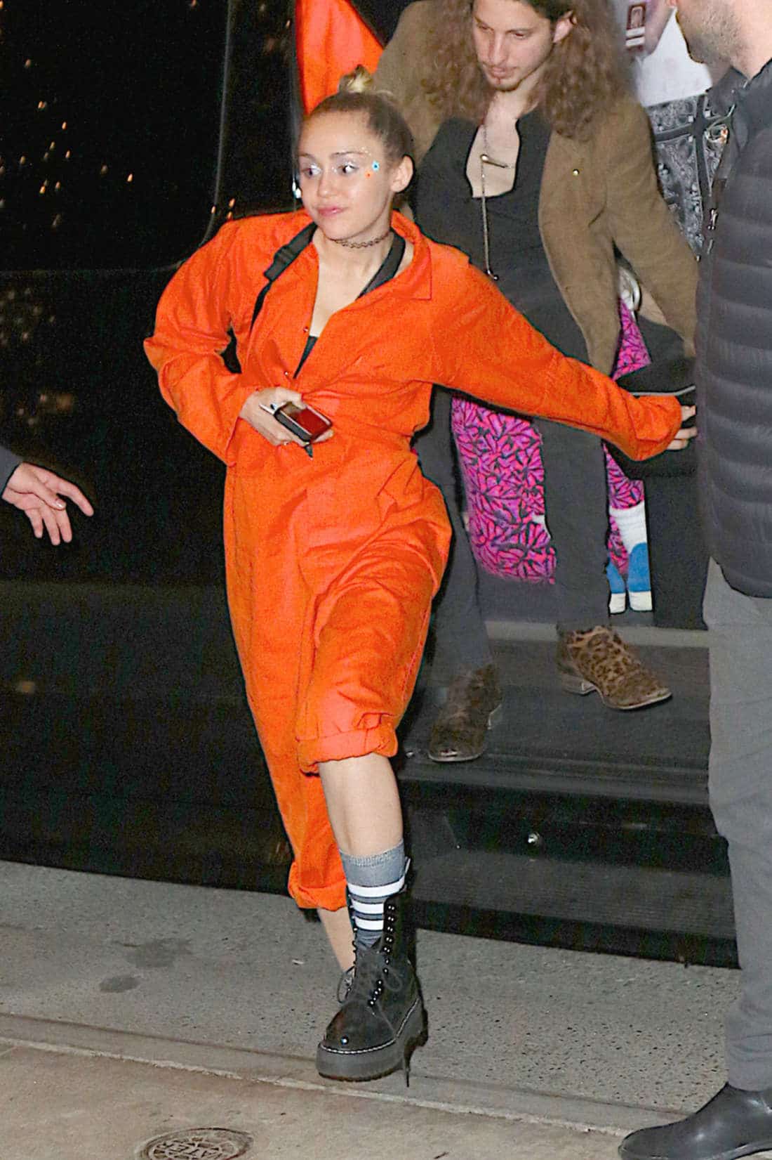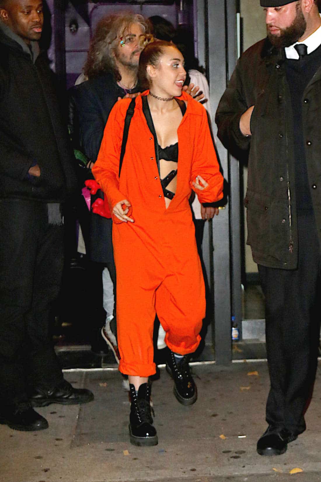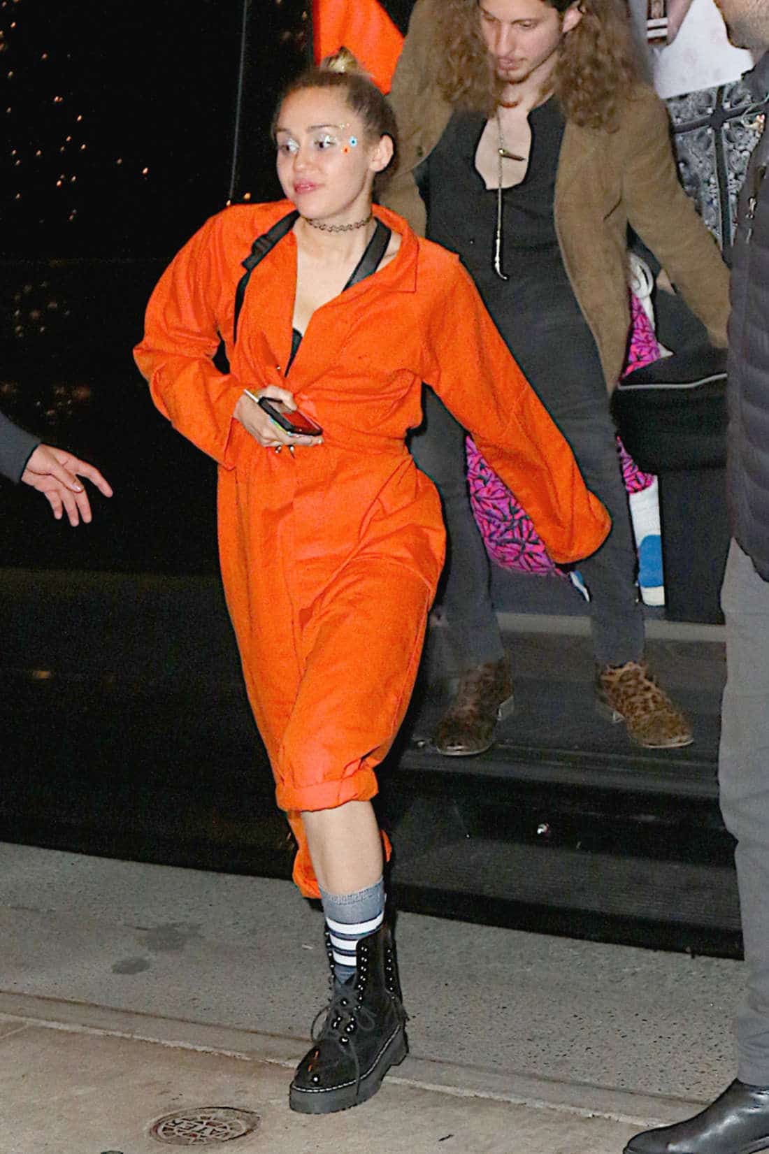 Miley Cyrus caused quite a stir in the lively city of New York with her latest fashion outing. Exiting the popular Up and Down nightclub, the talented artist turned heads with her fearless choice of attire. Dressed in a captivating orange jumpsuit, Miley not only flaunted her unique sense of style but also effortlessly merged boldness and sophistication, leaving spectators in complete admiration.