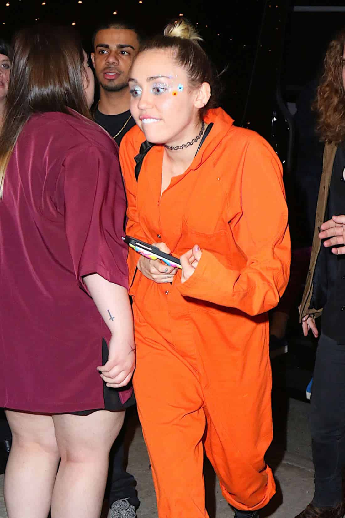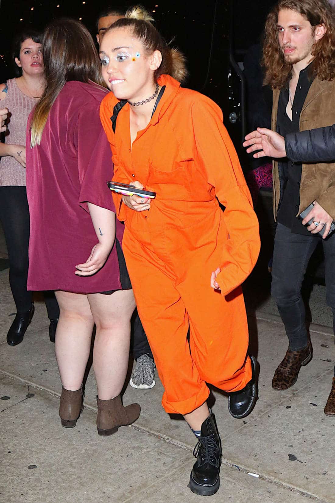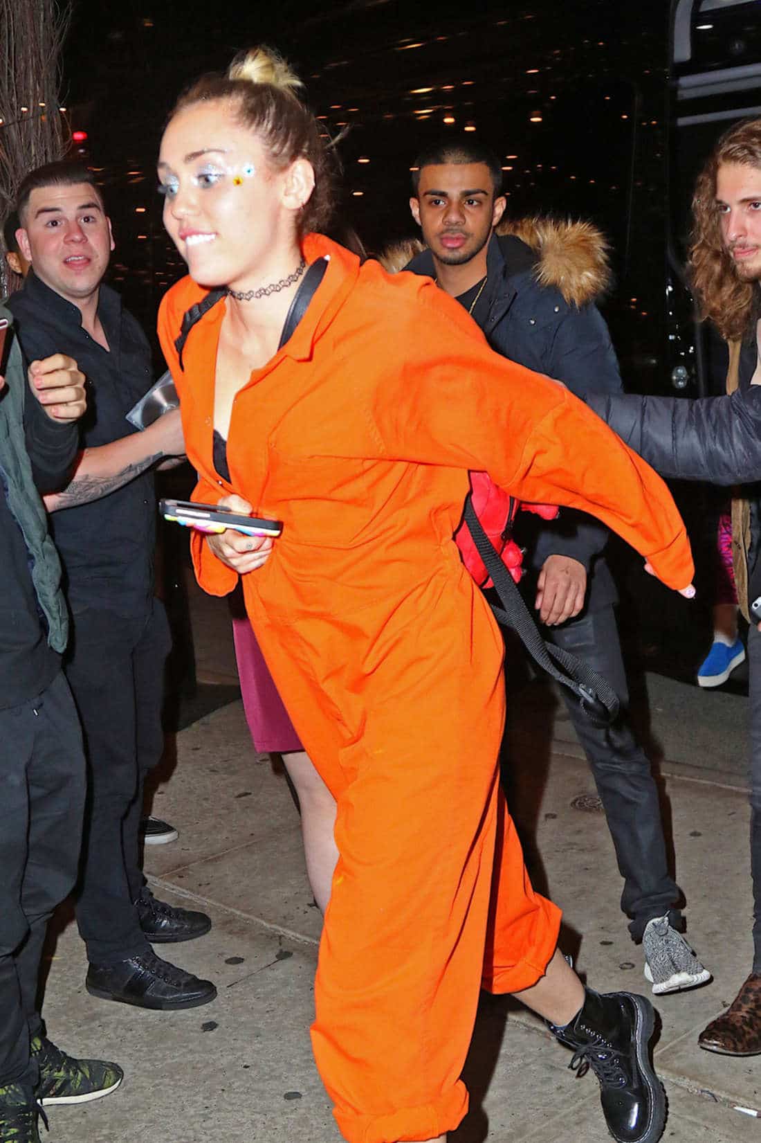 Miley Cyrus caused quite a stir in the lively city of New York with her latest fashion outing. Exiting the popular Up and Down nightclub, the talented artist turned heads with her fearless choice of attire. Dressed in a captivating orange jumpsuit, Miley not only flaunted her unique sense of style but also effortlessly merged boldness and sophistication, leaving spectators in complete admiration.