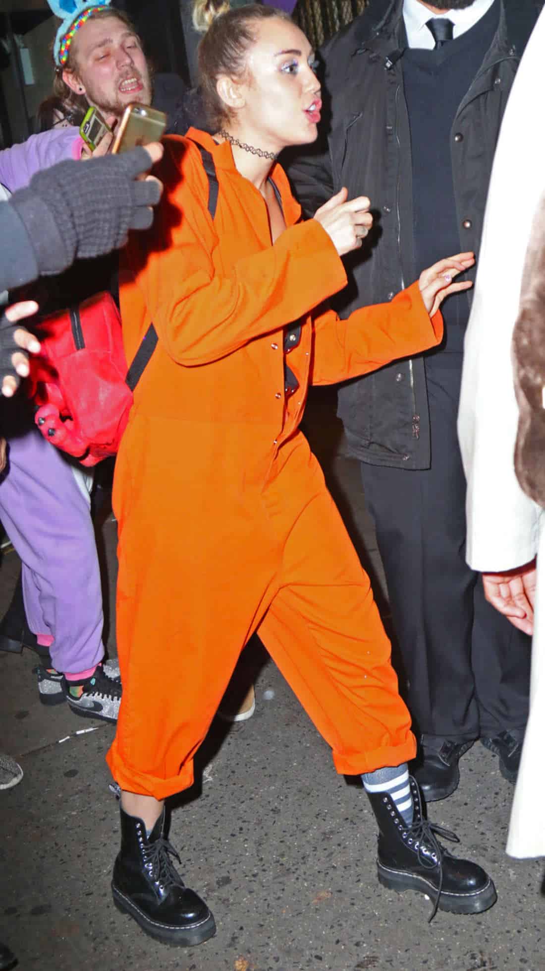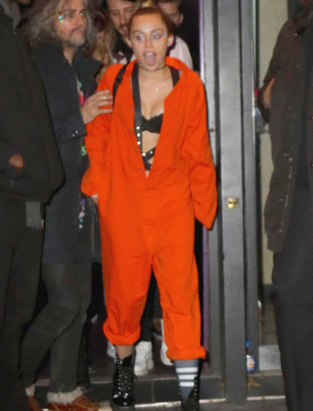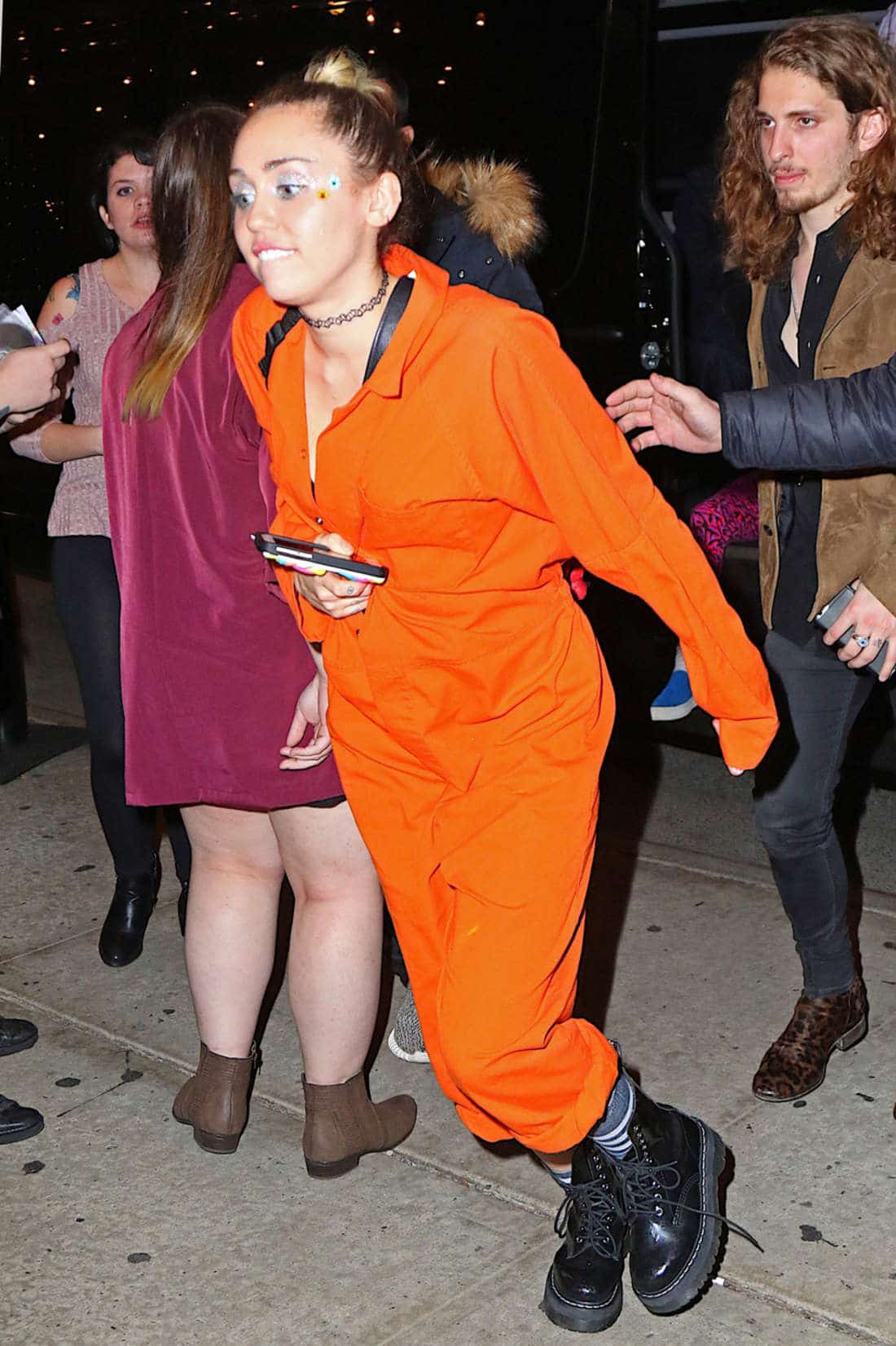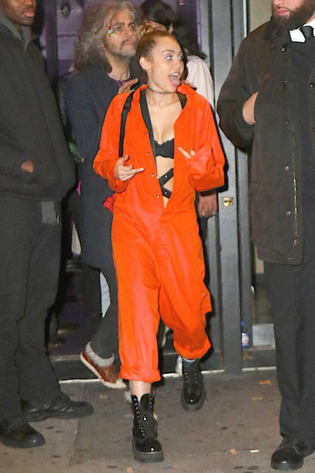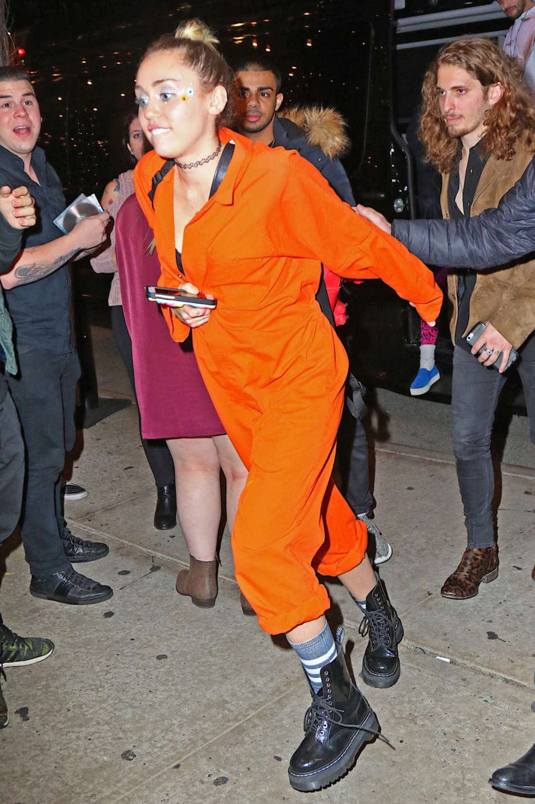 Miley Cyrus caused quite a stir in the lively city of New York with her latest fashion outing. Exiting the popular Up and Down nightclub, the talented artist turned heads with her fearless choice of attire. Dressed in a captivating orange jumpsuit, Miley not only flaunted her unique sense of style but also effortlessly merged boldness and sophistication, leaving spectators in complete admiration.