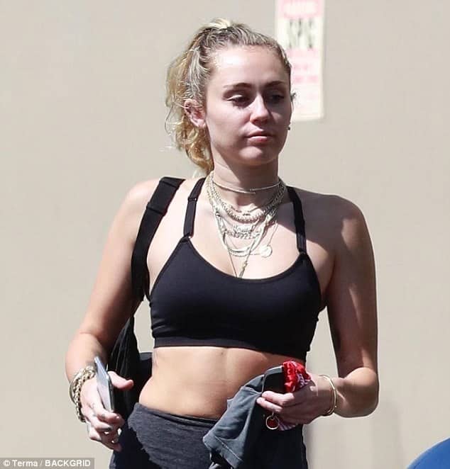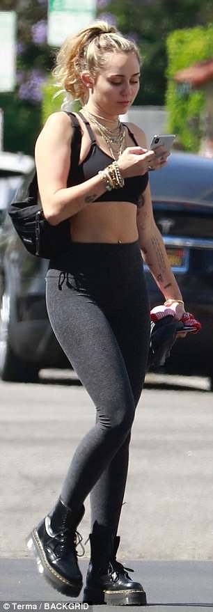 Miley Cyrus, who has a partnership with Converse, was spotted sporting a trendy athleisure outfit outside a gym in Los Angeles on Friday. The 25-year-old artist showed off her toned midriff in a black sports bra and charcoal-grey yoga pants, paired with $160 Dr. Martens ‘Molly Patent’ platform boots for her workout session. Despite wearing jewelry, including gold necklaces and bracelets, which are not typically ideal for working out, she managed to put her blonde hair up in a ponytail for easy movement. Watch her video below.