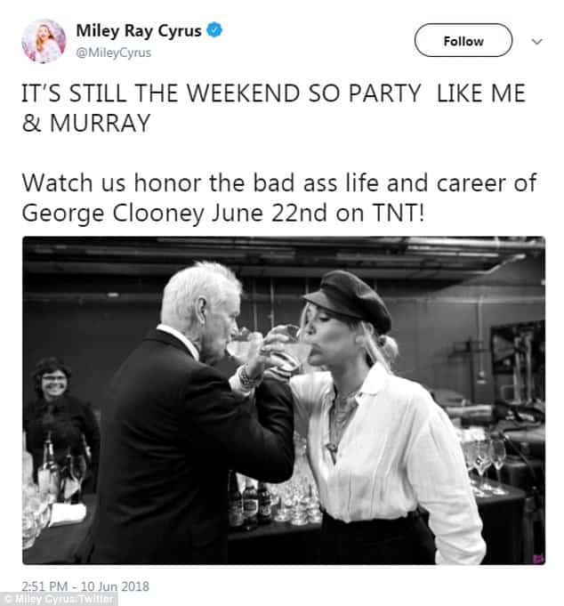 Let’s celebrate the amazing life and achievements of George Clooney! Recently, Miley (also known as Destiny) was spotted on the street, five days after sharing an adorable cocktail photo of her close friend Bill Murray during AFI’s tribute event. The televised tribute will be broadcasted on TNT on June 22nd.