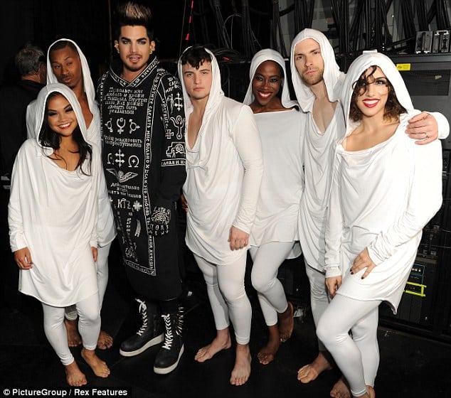 Casually Cloaked: Adam Lambert casually mingles with his crew of dancers clad in stylish white attire after their captivating performance.