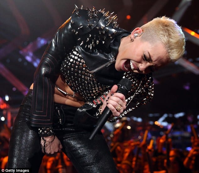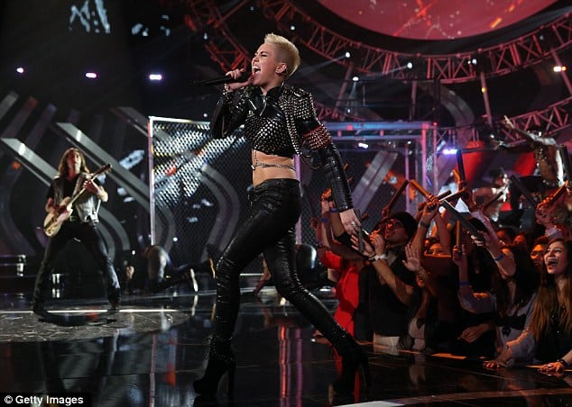 Great job: Miley Cyrus appeared genuinely joyful after her outstanding performance as she relaxed backstage.