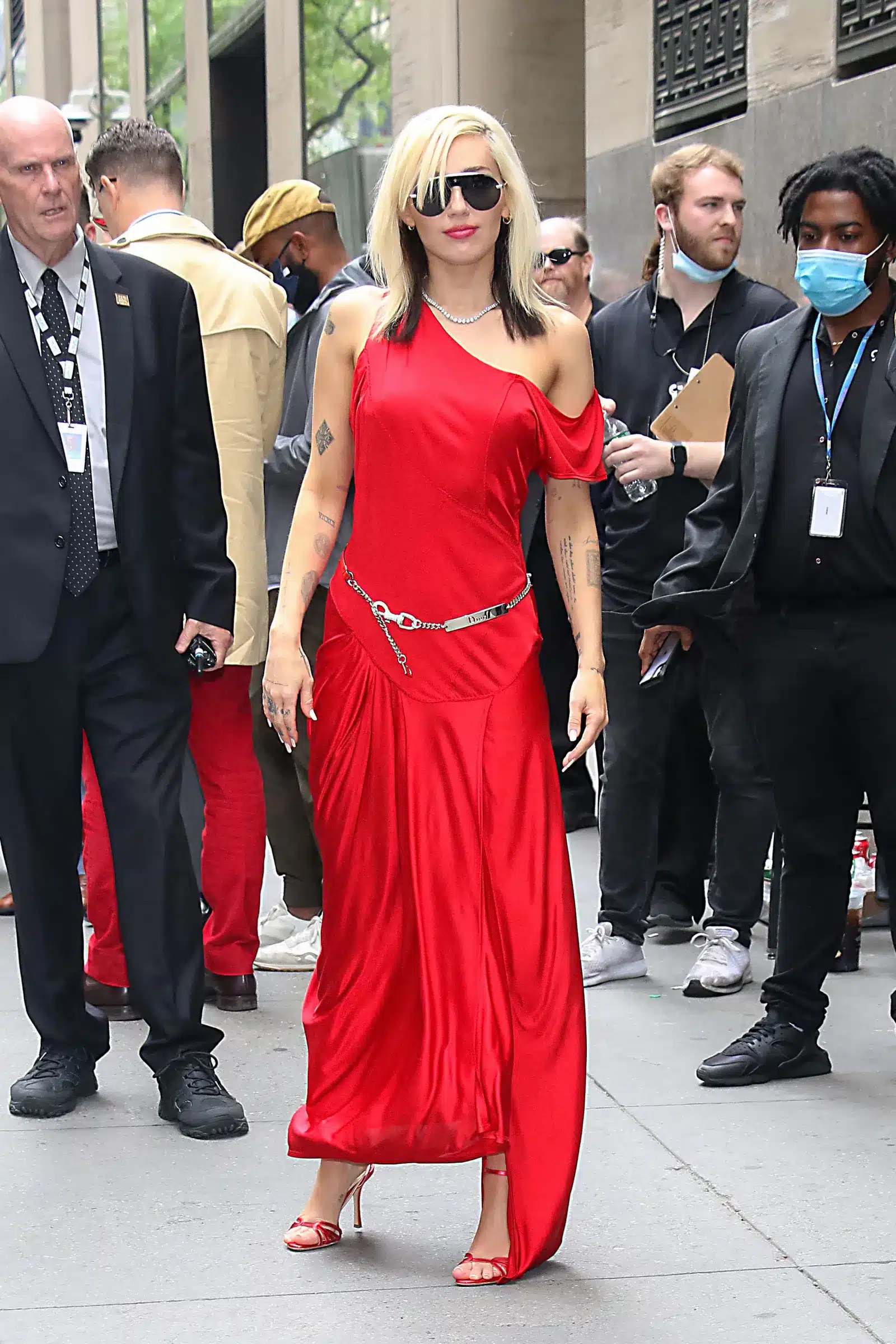 At Radio City Music Hall, Cyrus turned heads in a figure-hugging little black waffle-knit dress. This formfitting ensemble highlighted her curves and accentuated her confidence. However, before leaving the venue, she switched things up and slipped into a fiery red off-the-shoulder dress. Paired with matching metallic red strappy heels, this satin gown featured a stylish cold-shoulder design and dual high leg slits, reminiscent of the dancing red emoji.