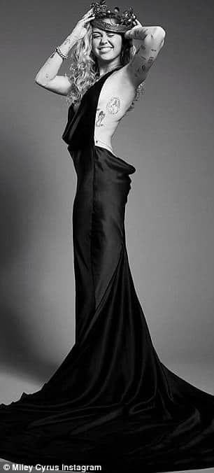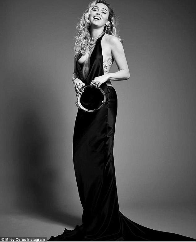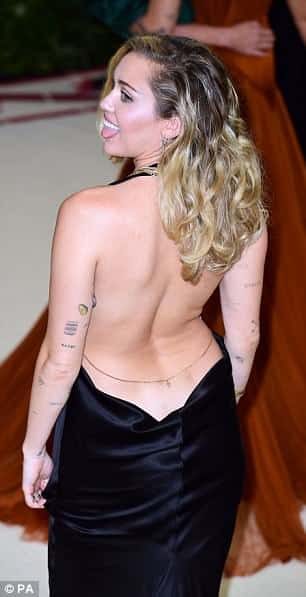 Miley opted to go sans bra in a very plunging black gown that exposed not only some of her tattoos but generous glimpses of flesh