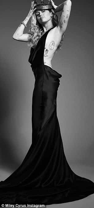 Miley opted to go sans bra in a very plunging black gown that exposed not only some of her tattoos but generous glimpses of flesh