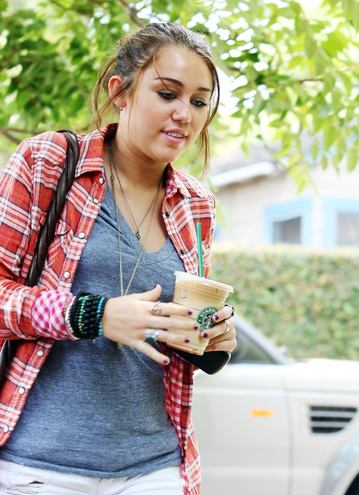 With a cup of steaming latte from Starbucks in hand, Miley Cyrus made her way to a Los Angeles salon with a cheerful disposition to get some fresh hair extensions. Accompanied by her brother Braison Cyrus and her on-again-off-again boyfriend Justin Gaston, the trio seemed to be enjoying their time together on August 30, 2009.