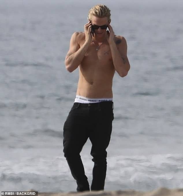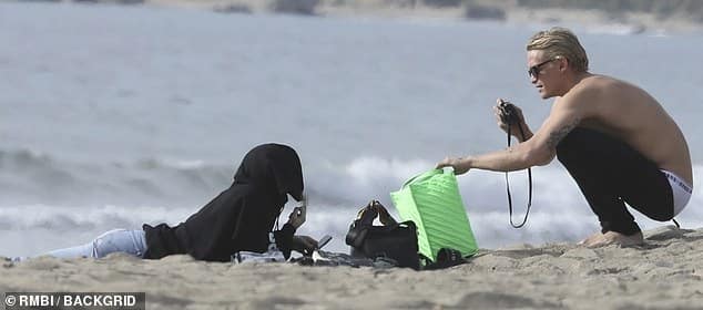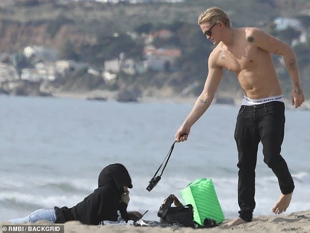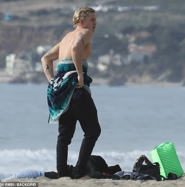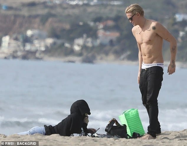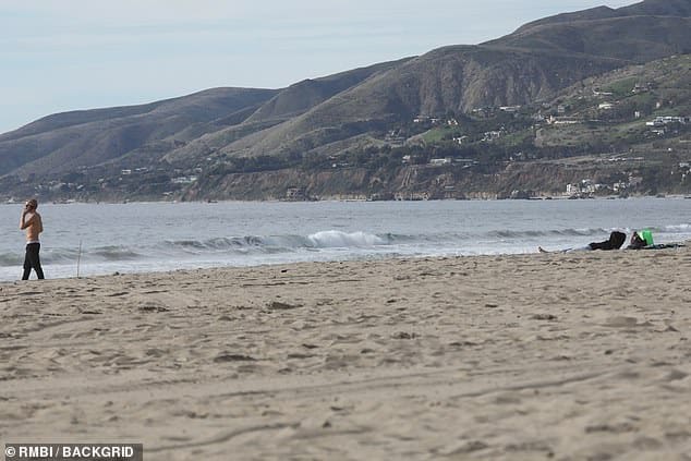 Amidst the lively atmosphere of a crowded beach, two individuals caught the attention of onlookers as they leisurely strolled along, engrossed in engrossing conversations over their mobile phones. Meanwhile, the radiant presence of Miley could be observed as she enjoyed the sun’s warmth while clad in a fashionable swimsuit, choosing to refrain from plunging into the invigorating yet chilly waters. Wrapping herself in a cozy hoodie and slipping into a pair of jeans, she revelled in the delightful comfort provided by the golden sand beneath her feet. At a later moment, a shirtless Cody returned to Miley’s side, but she seemed lost in her own world, potentially missing his approach as he was preoccupied with his ongoing phone call.