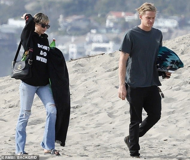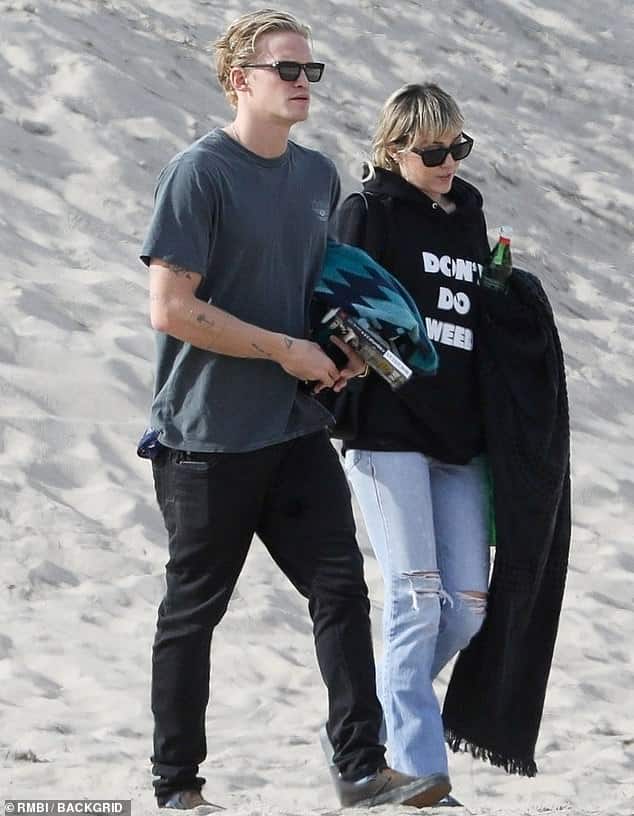 Miley Cyrus, 27, and Cody Simpson, 23, had a delightful outing on Monday, relaxing and enjoying each other’s company at Zuma Beach in Malibu. Miley, known for her incredible physique, decided to stay a little warmer by donning a stylish black one-piece swimsuit, despite the slightly chilly breeze. She looked effortlessly stunning as she later removed her black ‘DON’T DO WEED’ sweater and acid-washed jeans. On the other hand, Cody kept it simple yet cool, sporting a gray T-shirt and black jeans. While they were all set to relish their time on the beach, the talented Australian artist had to briefly attend to a phone call.