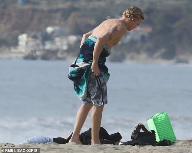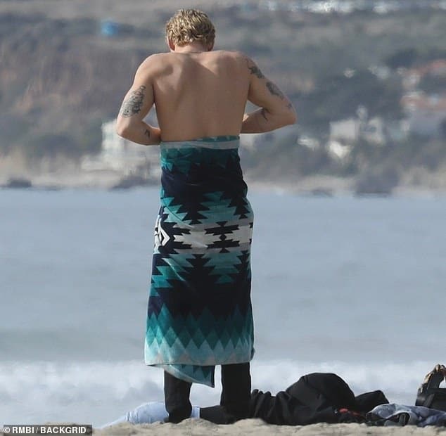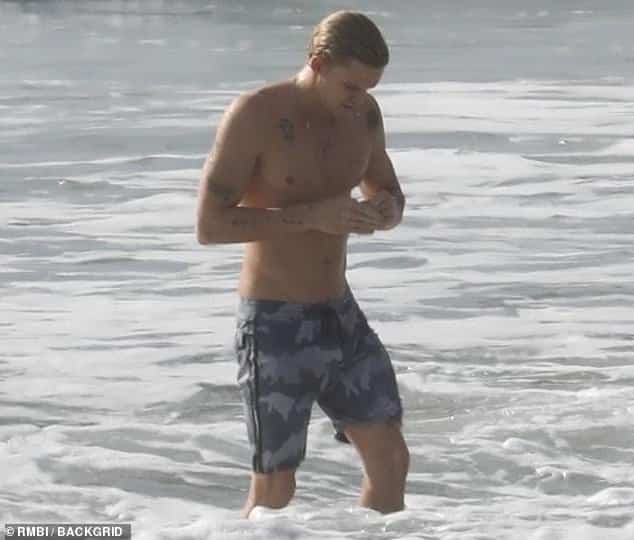 Short escapade: He indulged in a quick plunge into the frigid water before hastening back to Miley’s companionship.