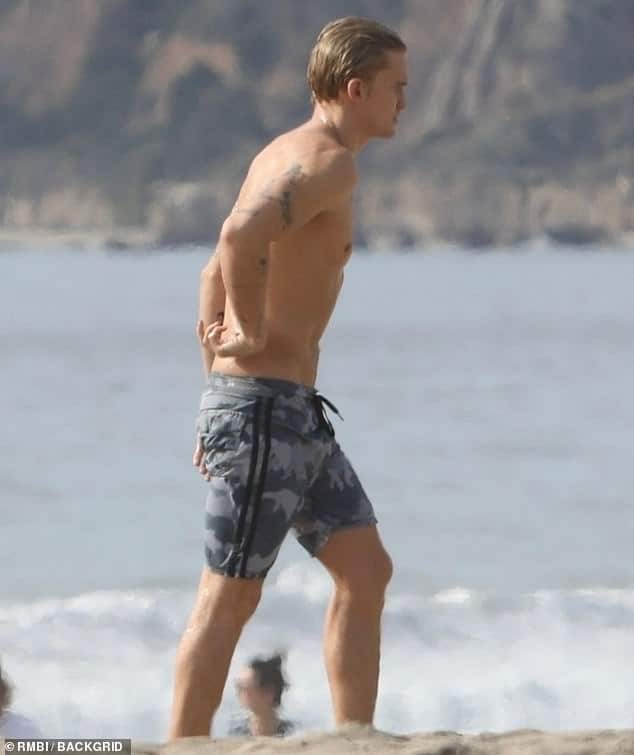 Cody confidently flaunted his perfectly toned body while wearing a bathing suit adorned with a stylish grey camouflage pattern.