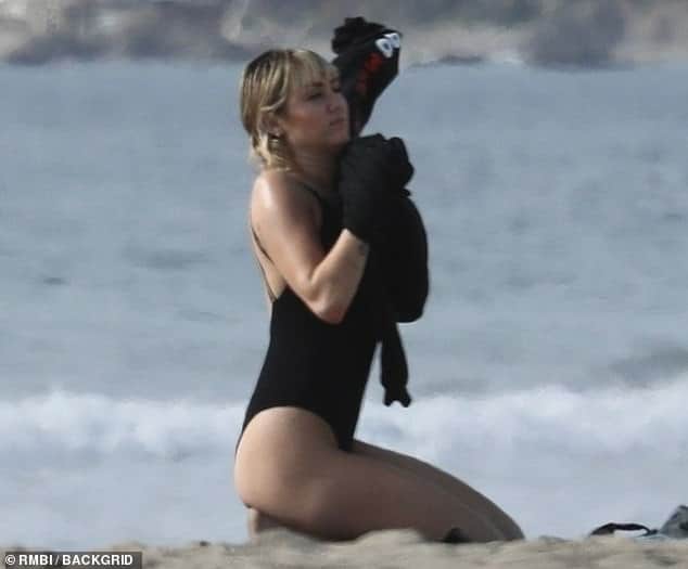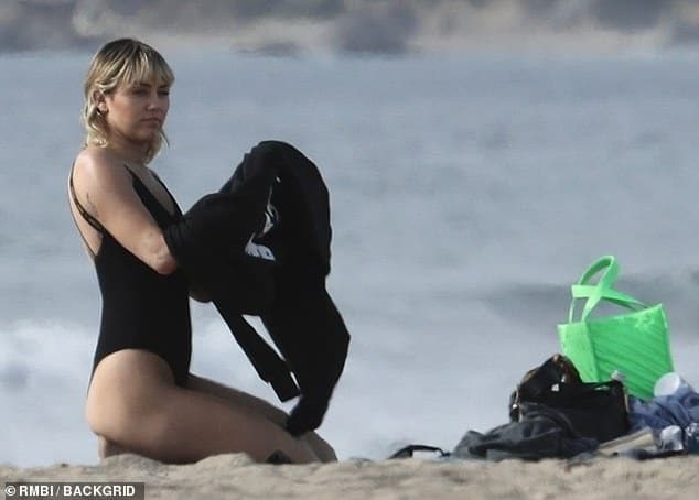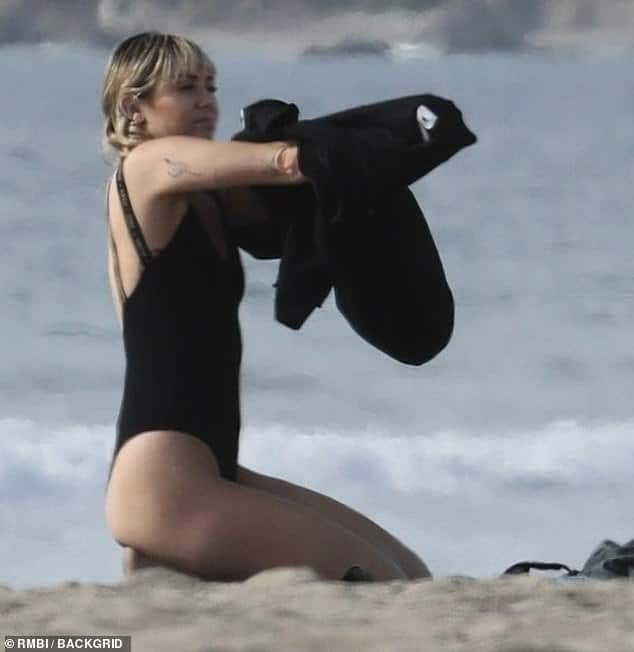 Miley is no stranger to flaunting her slender physique, but on this occasion, she opted for an elegant black bathing suit to brave the brisk breeze.