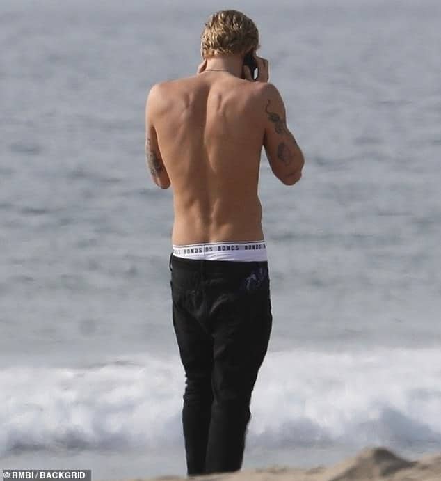 While chatting on the phone, the Australian musician appeared in a casual yet stylish attire, sporting black denim pants and pristine white undergarments. Notably, he even removed his gray shirt just moments before picking up the call.