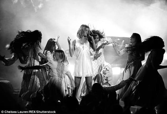 She wore identical white Puma shoes and socks that stopped just above her ankle to complete the ensemble. She was flanked by dancers dressed like wolves.