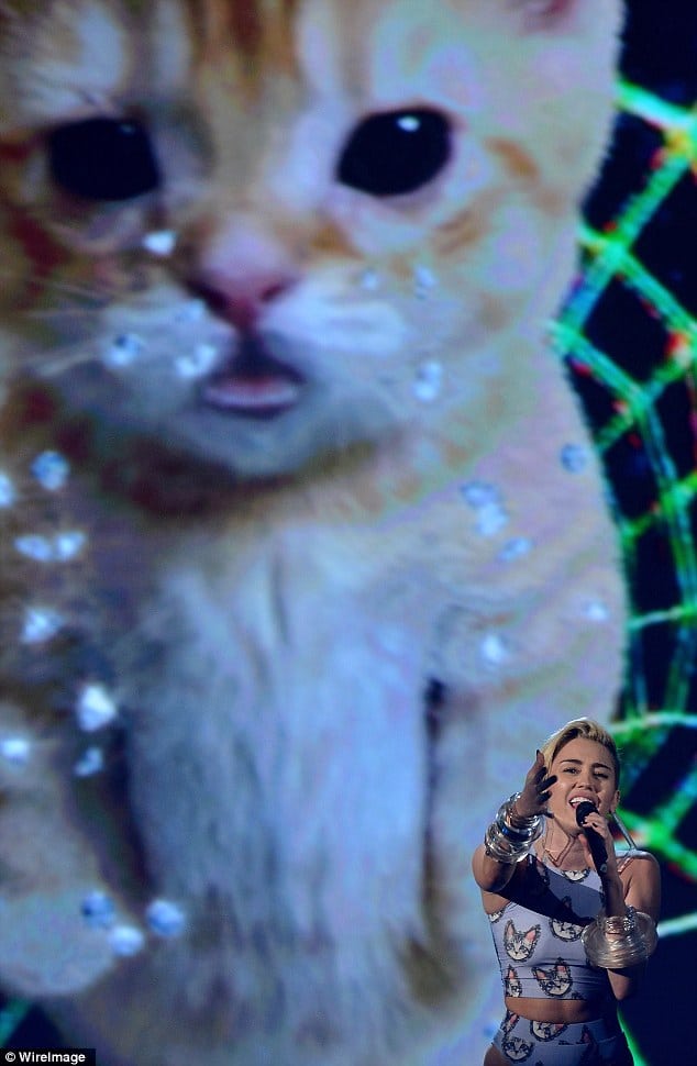 Miley was wearing a trendy two-piece bikini from the 80s that was covered in a cute pussy-cat print that matched her shoes. She had arrived in a white trouser suit, implying that she was planning to smarten up her image. However, the former Disney star proved that her provocative stage presence is here to stay. Standing on stage behind a gigantic cat that looked on the verge of tears, Miley belted out the notes of the song, which is rumored to be inspired by her breakup with Liam Hemsworth.