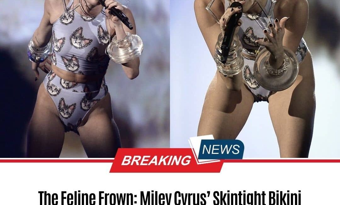 It’s no wonder why the cat is crying! Miley Cyrus wears a tight bikini to perform next to a large feline that appears somewhat sad.