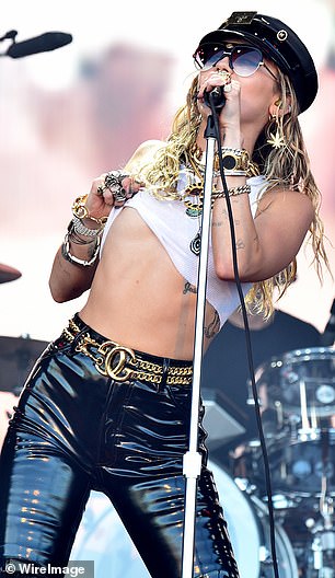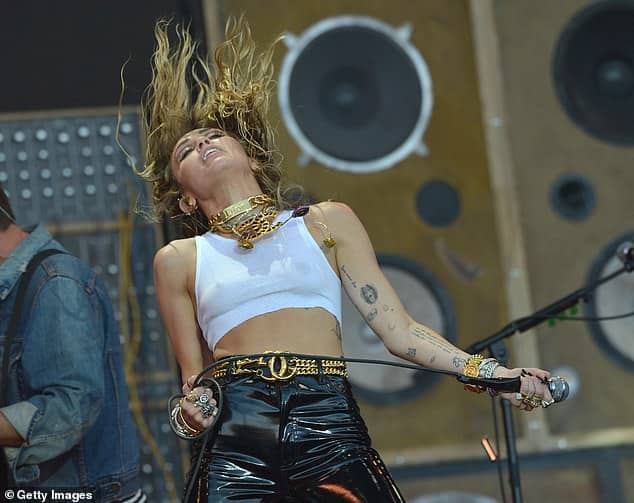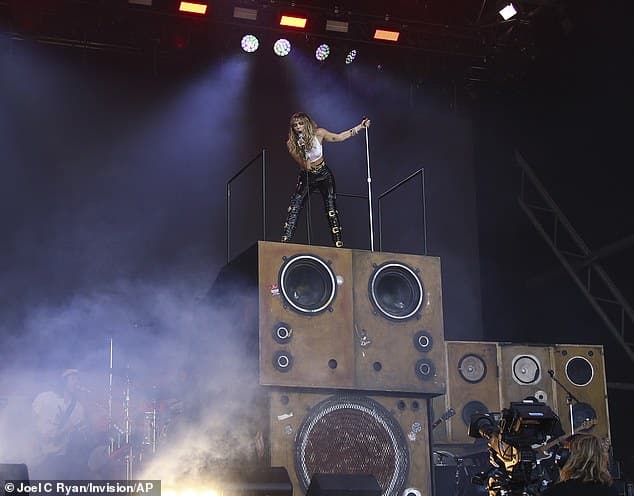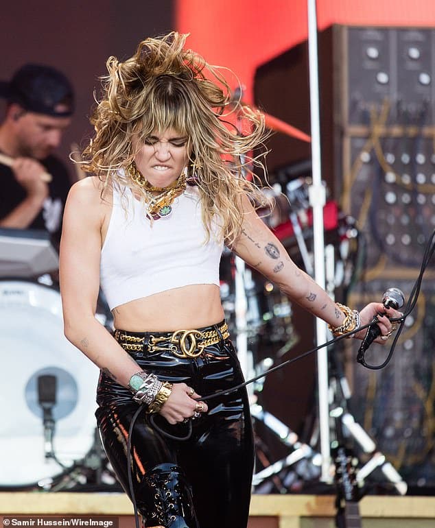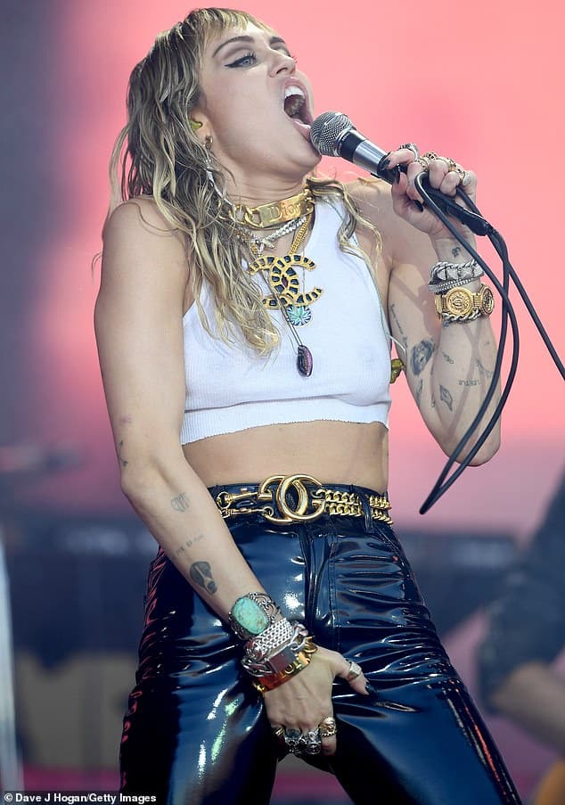Miley Cyrus, at the age of 26, gave an unforgettable performance on Sunday evening during Glastonbury Festival at Worthy Farm in Somerset. She rocked a pair of black vinyl trousers and thick high boots that featured chunky gold buckles. To complete her festival look, she wore a black baker-boy hat and round lens glasses. The Hannah Montana star added heaps of gold chains, including ones crafted by Dior and Chanel, wrapped around her neck, stacks of bangles, and a bling belt to accessorize. During her set, the former Disney Channel actress continued her provocative display by grabbing her crotch and licking the microphone for her audience.