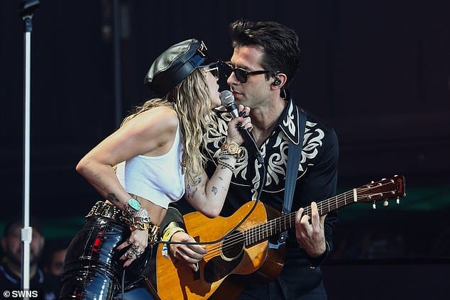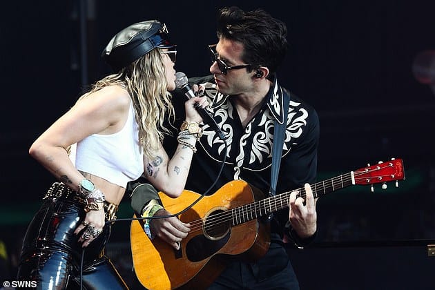 Miley Cyrus, also known as the Party In The USA singer, was seen embracing one of the guitarists during her performance. She paid tribute to Ashley O from the satirical TV series Black Mirror by wearing her character’s outfit. Miley donned a lilac wig, sequinned cap, bomber jacket, and knee-high boots as she confidently took to the stage to perform her hit song On A Roll. Unfortunately, some festival-goers were taken aback by the excessive amount of profanity used during her set.