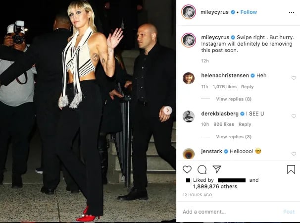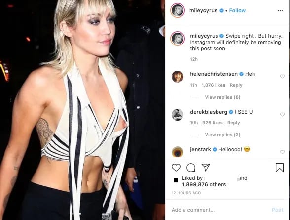 The credit for the photo goes to Instagram. It’s not a new thing for Miley to show off her nipples on social media. She had previously shared a picture in which her nipples were covered with a shirt, but it was transparent enough to reveal them. Alongside the post, she wrote that it would soon be deleted as she had been warned by Instagram. However, she thanked Instagram for supporting the freedom of nipples.