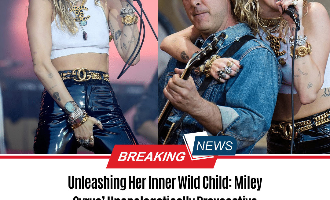 Miley Cyrus, at the age of 26, gave an unforgettable performance on Sunday evening during Glastonbury Festival at Worthy Farm in Somerset. She rocked a pair of black vinyl trousers and thick high boots that featured chunky gold buckles. To complete her festival look, she wore a black baker-boy hat and round lens glasses. The Hannah Montana star added heaps of gold chains, including ones crafted by Dior and Chanel, wrapped around her neck, stacks of bangles, and a bling belt to accessorize. During her set, the former Disney Channel actress continued her provocative display by grabbing her crotch and licking the microphone for her audience.