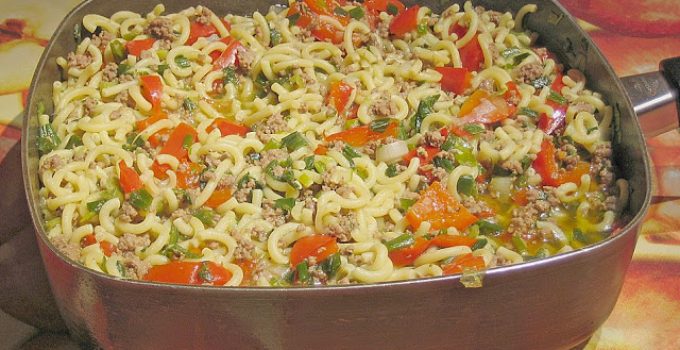 In der Zwischenzeit die Frühlingszwiebeln in nicht zu dünne Ringe schneiden und die Paprika würfeln. Zum Hack geben und kurz mit anbraten. Die Brühe angießen und die Gabelspaghetti unterrühren. Unter Rühren die Nudeln gar kochen lassen. Dann evtl. mit Soßenbinder oder Soßenpulver (oder Mehl) die 15-Minuten-Pfanne andicken. Abschmecken mit evtl. noch etwas Curry.
