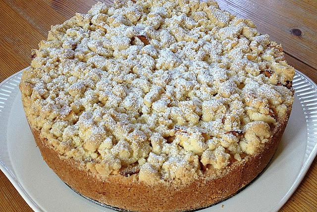 Für die Streusel alle Zutaten mit den Händen durcharbeiten. Pudding auf den Teig geben, darauf Äpfel und Streusel verteilen. Bei 165 Grad auf unterer Schiene ca. 60 Minuten backen. Aus der Form lösen und erkalten lassen.