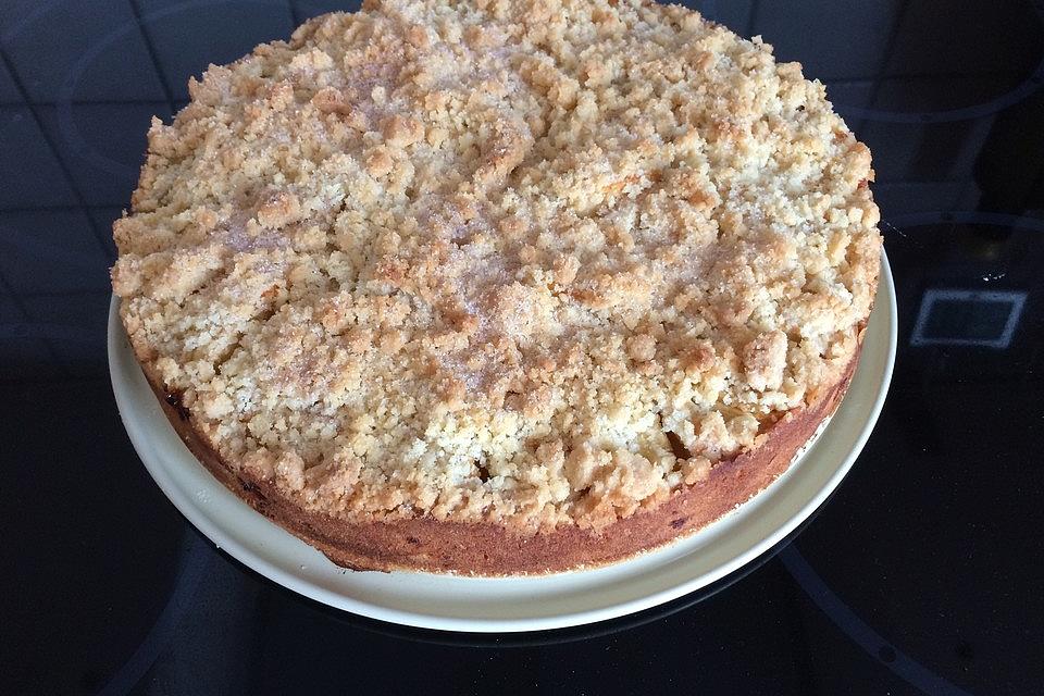 Der Streuselteig besteht aus Butter, Zucker, Vanillezucker und Mehl. Alles miteinander verkneten und in grobe Brösel zupfen und gleichmäßig auf den Früchten verteilen.