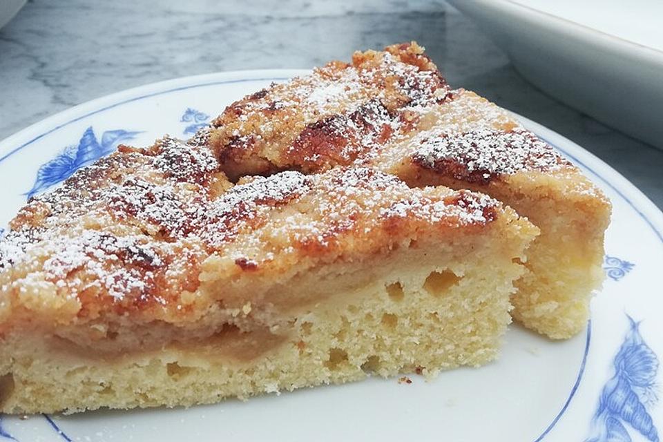 Eier und Zucker schaumig schlagen. Butter und Milch zum Kochen bringen und heiß zu der Eier-Zucker-Masse geben. Mehl und Backpulver unterheben. Den Teig gleichmäßig auf dem Backblech verteilen. Äpfel in Spalten schneiden und den Teig damit belegen.