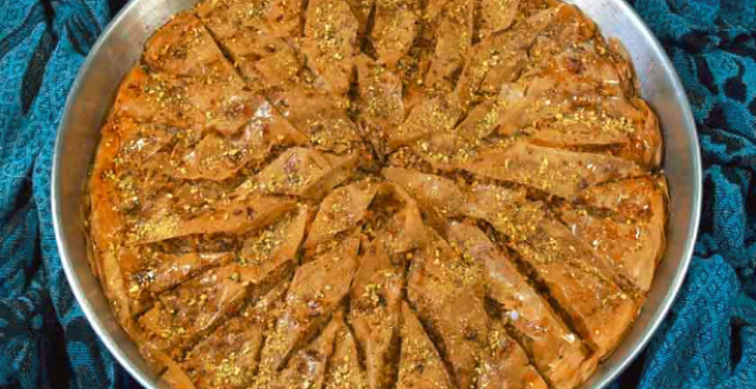 Zum Baklava backen eignet sich am besten einrundes Backblech. Besonders schön wird das Baklava mit einer speziellen Schneide-Technik, die weiter unten im Baklava-Rezept beschrieben ist.
